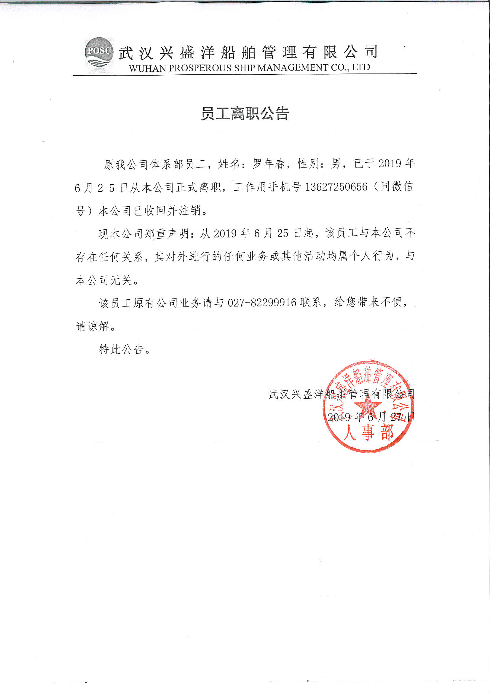 武漢興盛洋員工離職公告